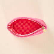 Add a cozy touch to your essentials with our Glam teddy pouch. Crafted from soft sherpa fabric, this pouch features a wipeable lining for easy cleaning, and gold zippers and hardware for a polished look. The interior is lined with a fun printed fabric, making it as stylish on the inside as it is on the outside