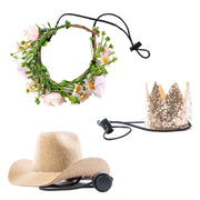 Variety Pack of 3 Hats (Birthday Crown, Flower Headband, Cowboy Hat) - Get your pet looking fabulous with this stylish and colorful Puparazzi Pawty Dog Hats! The trendy design and bright colors make it perfect for your pup's next birthday party or special occasion.