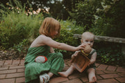 Details: Handmade and fair trade 100% cotton with polyester fill Soft, textured layers and bright colors Gentle rattle sound encourages sensory play Machine washable – gentle cycle