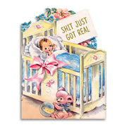 A funny vintage-inspired baby show greeting card. "Shit Just Got Real" A charming and witty way to celebrate the impending arrival of a little one.
