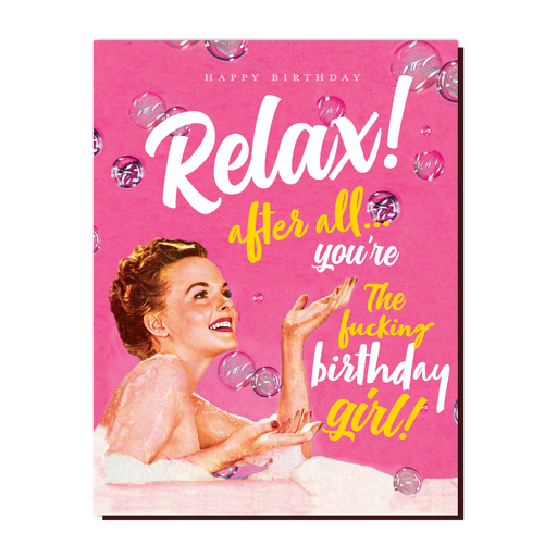 OFFENSIVE + DELIGHTFULStyle No. GR44 "Relax, after all you're the f*ing Birthday Girl!" birthday card, pink, bubbles, for women, funny greeting card Because who better ...