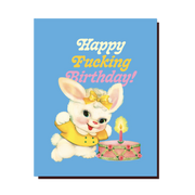 Little bunny says "Happy Fucking Birthday!" with a cake, and a single candle. Style No. NW16