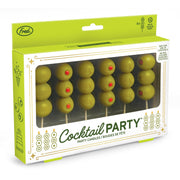 Olive your wishes will come true with Fred’s Cocktail Party candles. These quirky candles are shaped like classic martini olives and mounted on wooden picks—perfect for shaking up any celebration. Each of the six candles stands about 2" tall and comes packed in a festive, gift-ready window box with metallic gold details.
