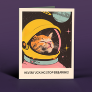 "Never fucking stop dreaming!" Style No. NW19 Funny, adorable, subversive and of course, taking you back to a more innocent time. space, cats, kittens, animal greeting cards, dreams, support, encouragement, graduation, funny adult greeting cards, swearing, profanity, cute and silly greeting cards, birthday cards, sorry, apology, get well