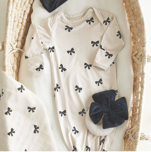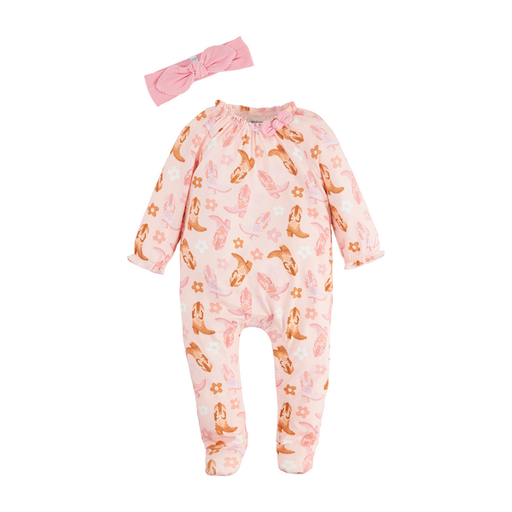 MUD PIE2-piece set. Knit bamboo footed sleeper with coconut wood button ruffle chest placket. Inner leg snaps. Comes with coordinating bow headband.
