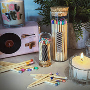 Each unit contains a mini cloche jar with 2” color tipped matches inside and striker stickers for lighting along the side.