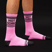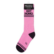 Inscribed with a haughty homophone, these bold babies will say it loud and proud, you are a HOT HOMO. High quality gym socks for a high-quality queer, pull em up and they'll stay right where you want them.