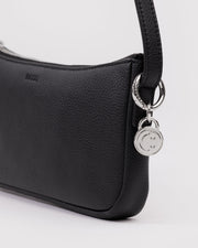 Made from recycled leather, our sleek Pochette features built-in card slots for organization, a metal smiley face charm, and an adjustable strap.