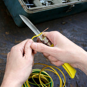 The No.09 DIY Folding Utility Knife is the perfect tool to have around the house, in your car, or even on a boat. The polymer handle is reinforced to withstand extreme temperatures and extended exposure to water. The drop-point blade is robust and great for tough jobs. It features two wire cutting notches which help make quick work of electrical applications. The handle can hold standard 1" bits and the tail end of the handle has a magnetic hole which lets you use the knife as a screwdriver for light-duty tasks. Make sure to close the blade of the knife and lock it with the Virobloc locking ring before using the included Philips and flat-head drivers.