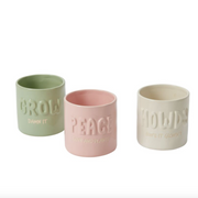 Meet the most playful home for your plants with the dimensional Plantism Pot Collection. Featuring different phrases using a mix of block lettering, resist technique, & carving in the natural clay, these watertight pots are a great gift for any plant lover, especially paired with drop-in plants.