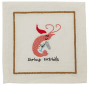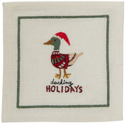 Celebrate the holidays with festive cheer and playful designs from the Tipsy Critter Cocktail Napkin Collection. Each slub cotton napkin features a unique critter in holiday attire, adding a touch of whimsy to your gatherings. Choose from a mallard duck with the punny phrase "ducking holidays," a pink shrimp with "shrimp cocktails," a red-nosed deer with "cheers, deers," or an owl with "the weary world rejoices." Each napkin is bordered with a coordinating chainstitch and pairs perfectly with cocktails, mocktails, and good company. Collect all four styles to complete your holiday tabletop.