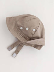 Perfect for year-round wear, this upf 50+ hat is functional and so handsome! Made in sand-colored twill, it has a flap to cover the neck and ears to protect from the wind. Three little buttons accent the crown. Made in an easy-care cotton and fully lined for comfort.