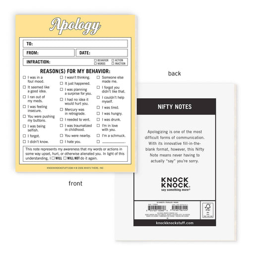 KNOCK KNOCKWith the Apology Nifty Note, we've taken the difficult, awkward act of contrition and made it easy. Now, by filling in the blanks, you never have t...