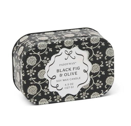PADDYWAXThe Black Fig & Olive Chérie Tin Candle features a patterned tin with two wicks, a hinged lid, and a removable label. Notes of green olive leav...