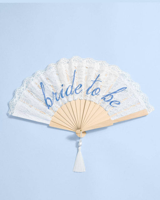 xo, Fetti- White lace folding fan with blue embroidered bride to be text - Lightweight wooden frame with tassel and pearl detail - Ideal something blue acce...