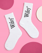 These Wifey socks feature a white cotton-blend material with bold black jacquard lettering designed for brides celebrating engagement, bridal showers, and bachelorette parties. The socks offer a cozy feel while maintaining a clean bridal aesthetic, making them suitable for gifting, lounging, and outfit styling. Their versatile wearable design provides comfort and visual appeal for weddings, parties, and everyday engaged use.